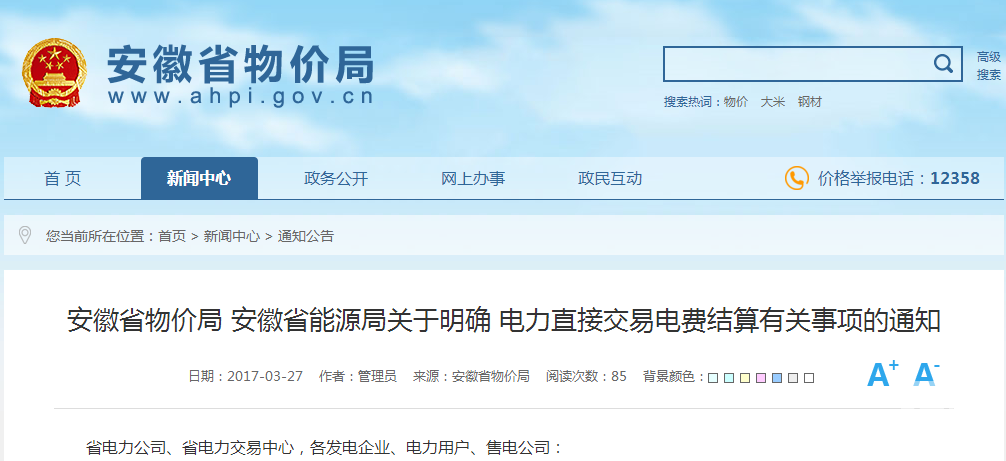 安徽省物價(jià)局 安徽省能源局關(guān)于明確電力直接交易電費(fèi)結(jié)算有關(guān)事項(xiàng)的通知