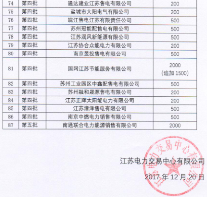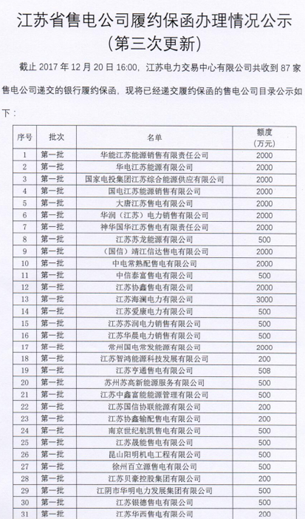 江蘇省電力交易中心日前公布了江蘇省售電公司履約保函辦理情況公示(第三次更新),截止2017年12月20日16:00,江蘇電力交易中心共收到87家售電公司遞交的銀行履約保函。詳情如下: