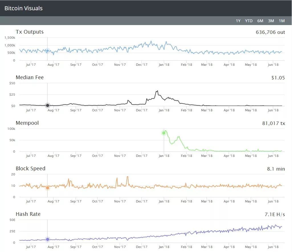 Bitcoin Visuals 展示的交易輸出、中間費用、內存池、區塊速度、哈希率等數據