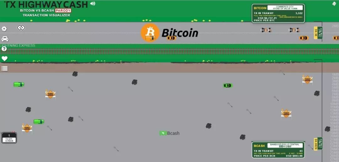 一個聰明的區塊鏈數據數據可視化網站,在模擬公路的動畫上呈現比特幣和比特幣現金的實時交易。動畫中的車輛大小和速度與區塊大小和交易速度掛鉤。動畫中還包括閃電網絡的交易。