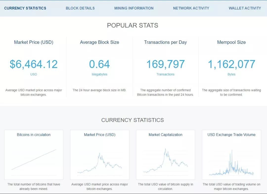 Blockchain.info 的數據統計包括平均區塊大小、每日交易量、內存池大小等等