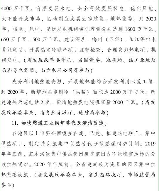 1月12日,廣東省人民政府發布《廣東省打贏藍天保衛戰實施方案(2018—2020年)》的通知,《方案》指出,有序發展水電,安全高效發展核電,優化風能、太陽能開發布局,因地制宜發展生物質能、地熱能等。
