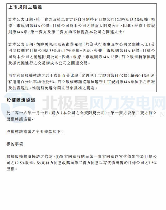 2018年1月10日,北控清潔能源全資附屬公司與第一及第二賣方訂立股權轉讓協議,同意收購第一賣方同意出售的北控風力發電有限公司12.5%股權;及第二賣方同意出售的7.5%股權。股權轉讓之零代價由買方、第一賣方及第二賣方經公平磋商后釐定。