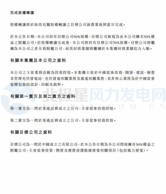 零代價!北控清潔能源全資附屬公司收購北控風力發電有限公司20%股權
