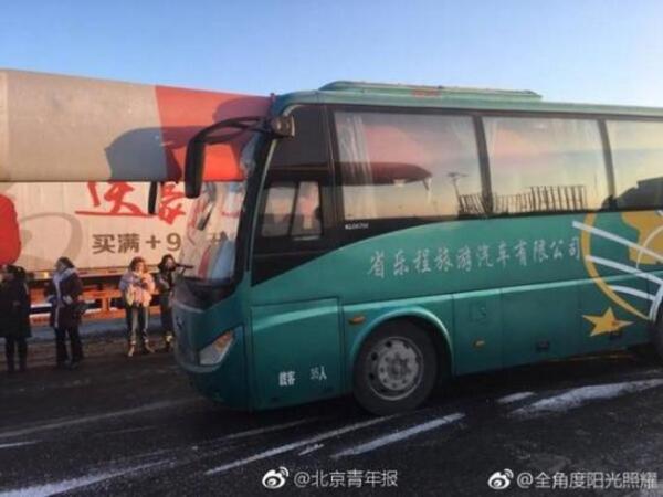 史先生給北青報記者提供的照片顯示,扇葉被平放裝在一輛運輸車上,扇葉尾端從大客車司機座位上方穿進大客車內。照片中顯示,路面上有一些雪,史先生表示,當地昨天曾經下過雪。他告訴北青報記者,據他所見,現場沒有人有明顯的外傷。