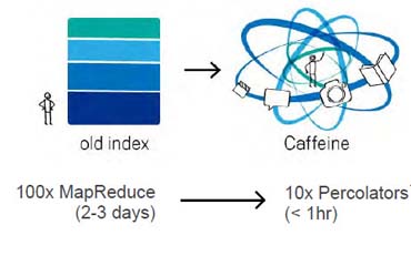 一是用基于Percolator的增量處理索引系統來取代MapReduce批處理索引系統,這個索引系統被稱作Caffeine,它比MapReduce批處理索引系統搜索更快。
