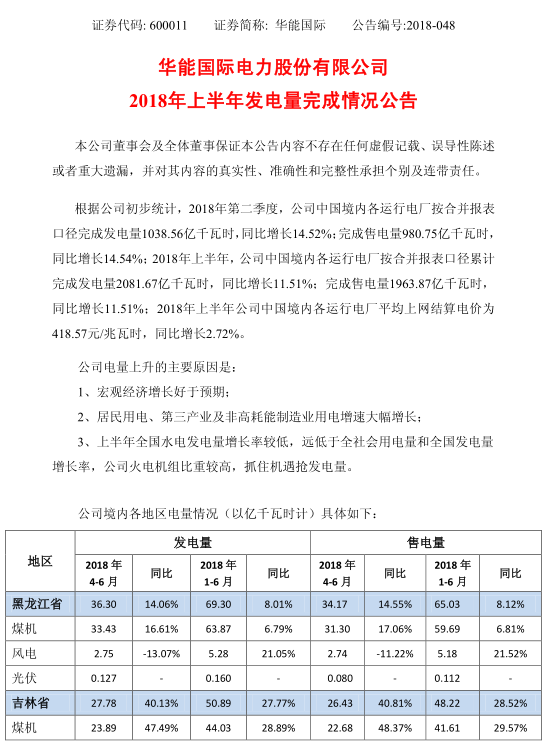 近日,華能集團旗下華能國際發(fā)布了2018年上半年發(fā)電量等經(jīng)營性情況,詳情如下: