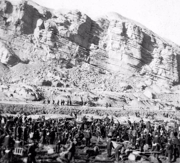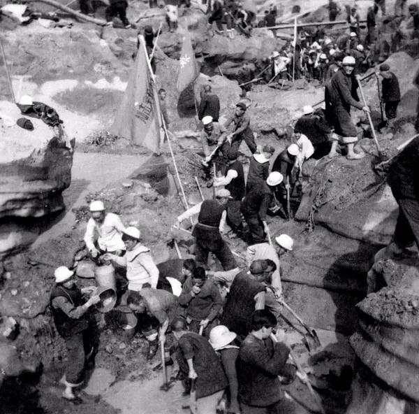 工程基礎開挖分為兩期,一期1959年4月截流前,為右岸基礎開挖階段;二期截流后至1960年底,為左岸基礎開挖階段。基本以手工開挖為主,主體共開挖石方49.39萬立方米,電站全部土石方開挖達96萬立方米。而這其中絕大部分都是依靠工人手中的大錘、鋼釬、鐵鍬完成的。