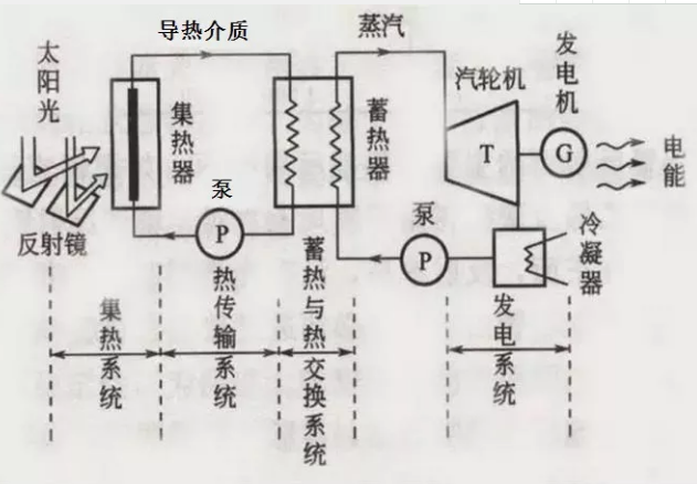 太陽能熱發(fā)電是將太陽能轉(zhuǎn)化為熱能,再將熱能轉(zhuǎn)化為電能的全新新能源應(yīng)用技術(shù)。它利用各種聚光鏡面聚集太陽的直接輻射,加熱導(dǎo)熱介質(zhì),經(jīng)熱交換產(chǎn)生高溫高壓的蒸汽,驅(qū)動汽輪機(jī)發(fā)電。通過熱交換器后的導(dǎo)熱介質(zhì)流體返回集熱場再次加熱,同時在系統(tǒng)中設(shè)置儲熱罐,存儲富余的熱能量,在太陽能不足時對系統(tǒng)進(jìn)行補(bǔ)給,從而加大了太陽能的利用效率。