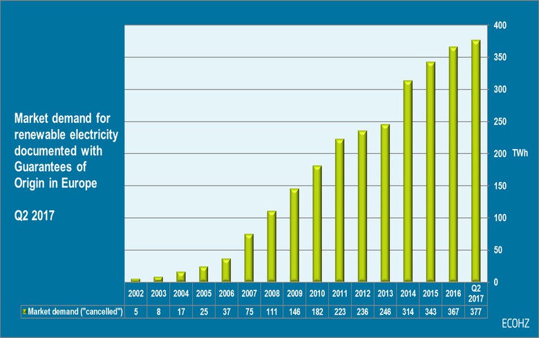 根據歐洲發行機構協會的數據,2017年二季度,歐洲綠色電力需求同比激增39%。