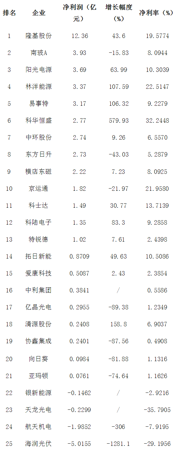 在這25家企業中,有一家企業盈利能力尤其強,其一家利潤總額比排名其后的三家企業的總和還要多。這家企業是何方神圣?它就是全球最大的單晶產品制造商——隆基股份。