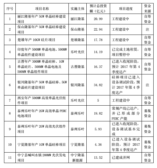 具體來說,銀川隆基年產 5GW 單晶硅棒項目和寧夏隆基年產 1GW 單 晶硅棒項目進入設備調試階段,古晉隆基年產 300MW 單晶硅棒、1GW 單晶硅片、500MW 單晶電池及500MW 單晶組件項目已進入收尾階段,預計均會在 2017 年第四季度全面達產;保山隆基年產 5GW 單晶硅棒項目和西安年產 500MW 組件項目的廠房建設正加速推進。