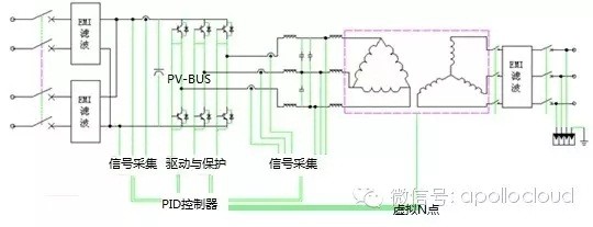 工作原理:此工作原理是利用逆變器交流輸出虛擬N線電壓采集時以PV-BUS母線中點作為參考點;此方案是通過采集器實時采集PV-BUS母線電壓, PID控制模塊抬升逆變器N點對地電壓300-500V,將N點電壓抬升至半母線電壓,從而將逆變器PV-BUS母線中點對地電壓抬升300-500V。