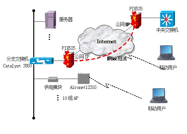 1、 在遼寧電力勘測設計院本部和紫薇仙莊分部的Internet出口處,部署PIX525 UR防火墻。PIX525之間通過VPN配置,建立IPSec隧道,組成遼寧電力勘測設計院的VPN系統,實現院本部局域網系統與渾南紫薇仙莊之間互聯互通。同時在紫薇仙莊2樓網管中心機房部署分支交換機、服務器、ACS3.3認證系統、UPS、AP的供電模塊,并通過超5類UTP雙絞線與報告廳及各會議室墻壁上安裝的AP無線接入點相連。