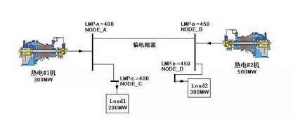 以簡(jiǎn)單的4節(jié)點(diǎn)系統(tǒng)為例:熱電#1機(jī)、熱電#2機(jī)最大發(fā)電能力分別為300MW和500MW;NODE_A與NODE_B之間存在輸電阻塞;LMP_a= LMP_c =400;LMP_b= LMP_d =450;