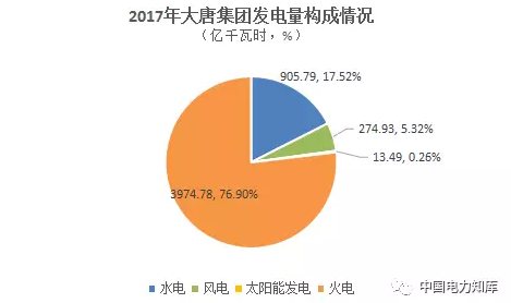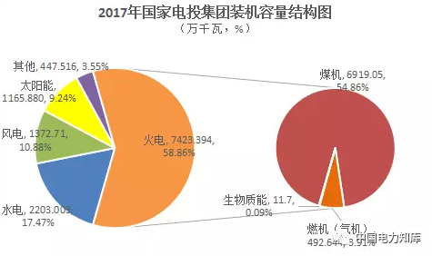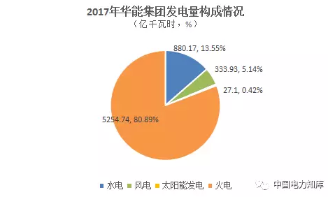 2017年,華能集團電力投資380.46億元,其中,水電102.89億元,火電104.22億元,風電97.31億元,太陽能發電59.76億元,其他16.28億元;大唐集團電力投資313.92億元,其中,水電62.63億元,火電148.79億元,風電92.7億元,太陽能發電9.8億元;華電集團電力投資332.53億元,其中,水電92.96億元,火電160.31億元,風電45.59億元,太陽能發電33.66億元;國家電投集團電力投資778.76億元,其中,水電26.16億元,火電225.71億元,風電177.4億元,太陽能發電265.42億元,其他63.87億元。國家能源集團電源投資占總投資68%,水電、風電等可再生能源投資占主業投資31%。