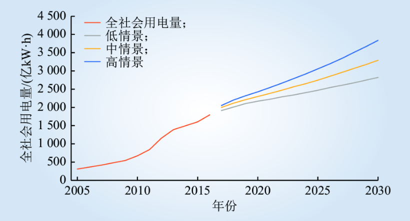 圖 2 2017—2030年新疆全社會用電量分情景預(yù)測