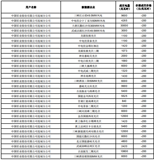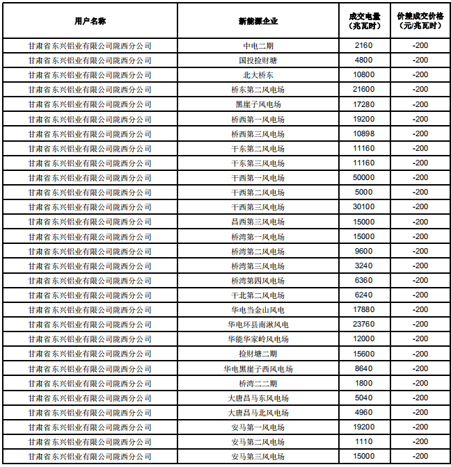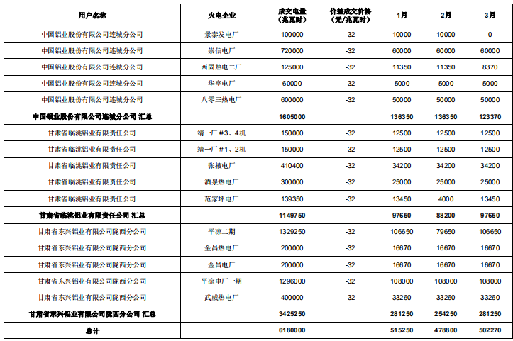 甘肅東興鋁業有限公司隴西分公司成交電量45 56788億千瓦時;中國鋁業股份有限公司連城分公司成交電量21 36295億千瓦時;甘肅省臨洮鋁業有限責任公司成交電量15 30208億千瓦時,成交電量共82 23291億千瓦時。