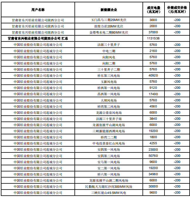 甘肅電力交易中心發布了《甘肅省2019年電解鋁與常規火電、新能源發電企業直接交易結果公告》
