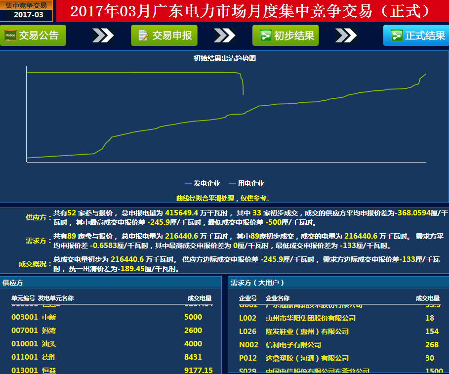 【無所不能 文丨張驥】根據廣東省3月份集中競價交易初步結果顯示(未經安全校核),此次集中交易總成交電量初步為 216440 6 萬千瓦時。 供應方邊際成交申報價差 -245 9厘 千瓦時, 需求方邊際成交申報價差