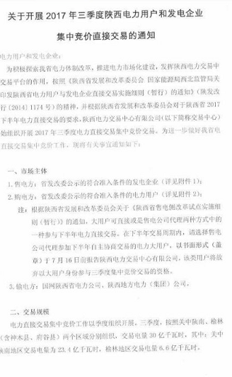 陜西電力交易中心日前發布了《關于開展2017年三季度陜西電力用戶和發電企業集中競價直接交易的通知》,此次交易電量30億千瓦時,分兩個區域組織交易,其中關中陜南區域交易電量23 4億千瓦時,榆林地區交易電量6