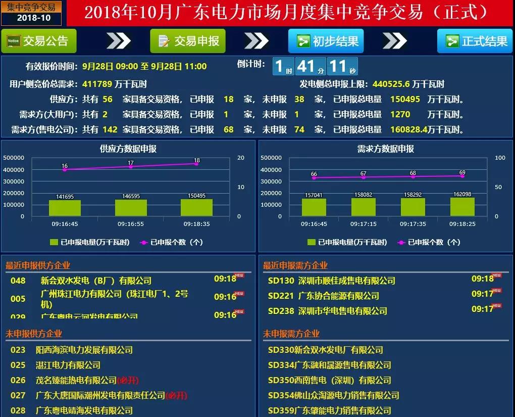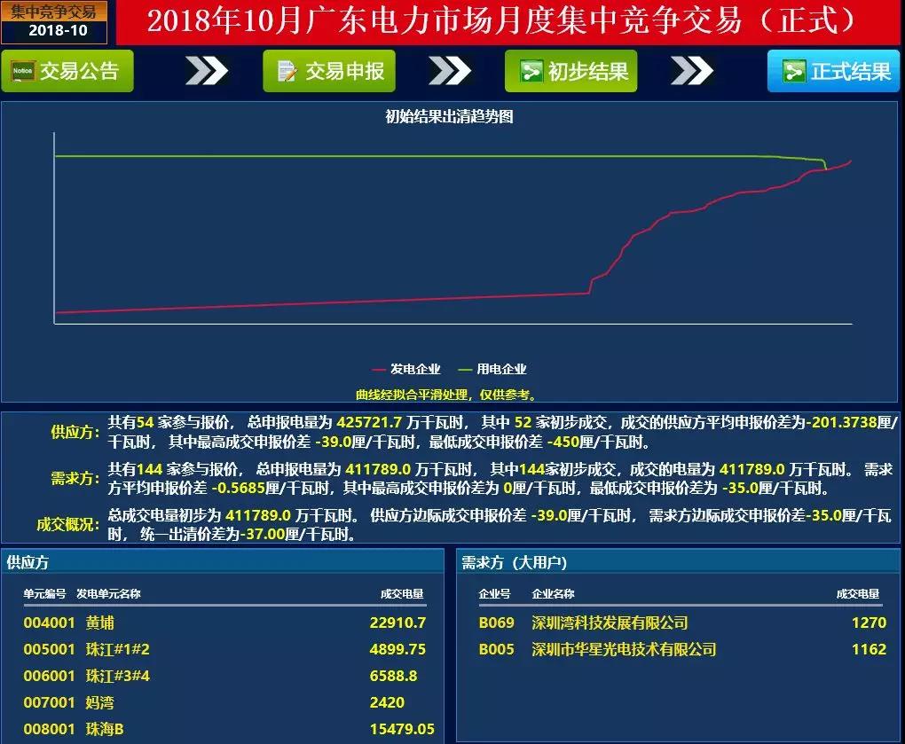 共有54 家參與報價, 總申報電量為 425721.7 萬千瓦時,其中 52 家初步成交,成交的供應方平均申報價差為-201.3738厘/千瓦時, 其中最高成交申報價差 -39.0厘/千瓦時,最低成交申報價差 -450厘/千瓦時。