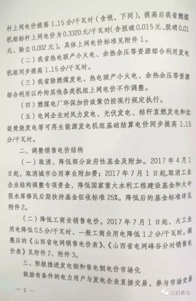 1.山西燃煤發(fā)電機組標桿上網(wǎng)電價提高1.15分/千瓦時,提高后燃煤機組標桿上網(wǎng)電價為0.332元/千瓦時。