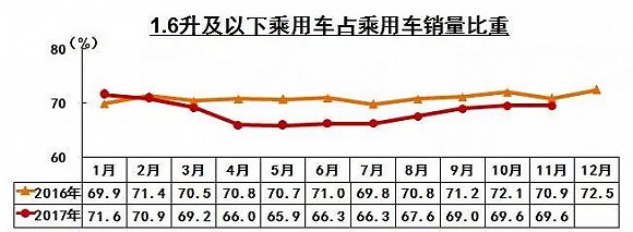 查看2017年前11月單月銷量不難發現,除了1月銷量略高于2016年同期之外,其余月份銷量均低于2016年單月銷量。并且2017年1.6升及以下小排量乘用車總體銷量趨勢呈現下降態勢,僅2017年第三季度和第四季度銷量表現來看,單月銷量徘徊在69萬輛左右。中汽協表示1.6升及以下排量乘用車購置稅優惠政策刺激車市的疲態已經顯現,從銷量來看“年終翹尾”并不會出現。