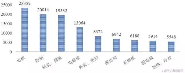 專利分類排序統計可知,國內燃料電池技術研發的重點依次為,電極、制氫、儲氫、電解質、控制、催化劑等技術。
