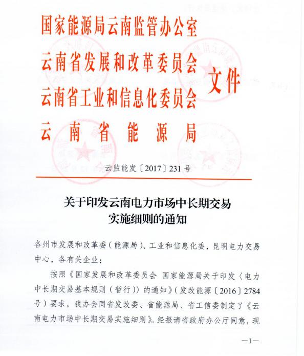 國家能源局云南監管辦、云南省發改委、云南省工信委、云南省能源局日前聯合下發了《云南電力市場中長期交易實施細則》,在通知中,明確指出