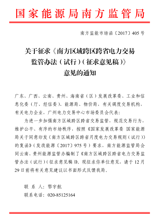 國家能源局南方監管局日前發布了《關于征求南方區域跨區跨省電力交易監管辦法(試行)(征求意見稿)意見的通知》,辦法適用于南方區域(廣東、廣西、海南、云南、貴州)跨區跨省電力交易監管。在征求意見期間,有意見可以反饋到國家能源局南方監管局,截止日期為12月29日。