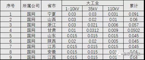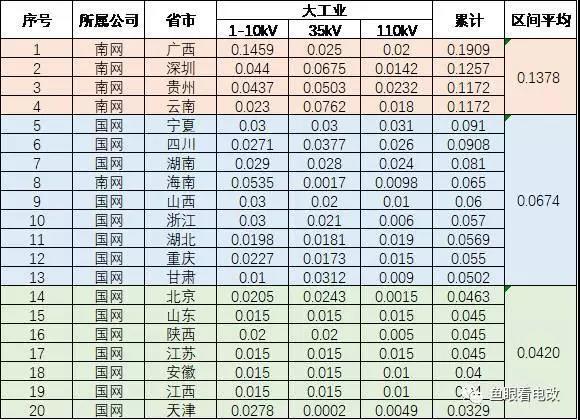 這些省市包括北京、陜西、安徽、江西、天津等7個省市,110kV及以下大工業配電平均價格在0.0420元/KWh。