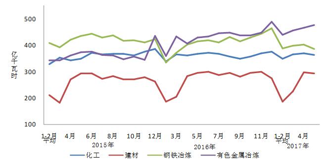 5月份,四大高載能行業用電量合計1520億千瓦時,同比增長1.1%,增速比上年同期提高2.0個百分點,占全社會用電量的比重為30.6%。其中,化工行業用電量364億千瓦時,同比增長1.2%,增速比上年同期回落4.5個百分點;建材行業用電量293億千瓦時,同比下降0.7%,增速比上年同期回落1.5個百分點;黑色金屬行業用電量385億千瓦時,同比下降8.2%,增速比上年同期回落3.4個百分點;有色金屬冶煉行業477億千瓦時,同比增長11.3%,增速比上年同期提高14.8個百分點。