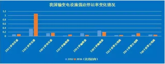 從強迫停運率上看,近五年,我國變壓器、斷路器、架空線路三類輸變電設施強迫停運率下降幅度較大。2016年,我國變壓器、斷路器、架空線路強迫停運率,較2012年分別下降0.037次/百臺年、0.052次/百臺年和0.008次/百臺年。