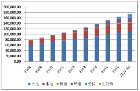 截止到2017年三季度末,我國煤電裝機(jī)10.81億千瓦,水電3.39億千瓦,核電3582萬千瓦,風(fēng)電1.57億千瓦,光伏1.2億千瓦,生物質(zhì)1423萬千瓦;火電裝機(jī)占全部裝機(jī)容量的61.87%,水電裝機(jī)占19.4%,核電占2.05%,風(fēng)電占9.0%,光伏占6.87%,生物質(zhì)占0.81%。