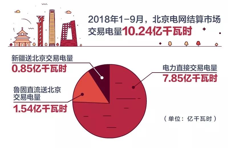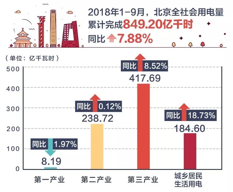 2018年1~9月,北京全社會用電量累計完成849.20億千時,同比增長7.88%。其中,第一產業8.19億千瓦時,同比下降1.97%;第二產業238.72億千瓦時,同比增長0.12%;第三產業417.69億千瓦時,同比增長8.52%;城鄉居民生活用電184.60億千瓦時,同比增長18.73%。2018年1~9月,北京電網結算市場交易電量10.24億千瓦時,其中電力直接交易電量7.85億千瓦時,魯固直流送北京交易電量1.54億千瓦時,新疆送北京交易電量0.85億千瓦時。