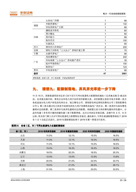 猜想九:配額制落地,棄風棄光率進一步下降??稍偕茉措娏ε漕~制三次征求意見,可能在2019年1月1日起正式落地執(zhí)行考核,有望進一步增強市場主體對風電、光伏的消納意愿,降低棄風棄光率。