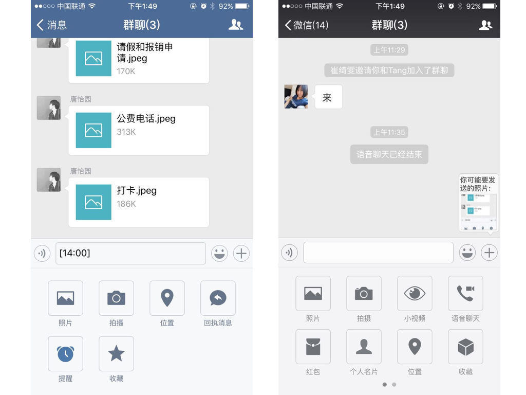 企業(yè)微信在聊天界面是精簡化的微信:小視頻錄制、名片分享、卡券分享、發(fā)紅包、轉(zhuǎn)賬、語音輸入都沒有在聊天的功能組件里出現(xiàn)。