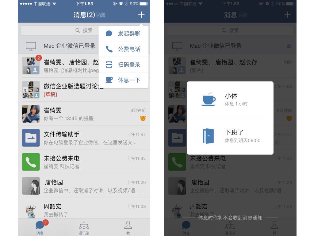 和微信 24 小時在線的邏輯不同,企業(yè)微信首頁菜單里還加入了一個名為“休息一下”的功能。員工可以選擇“小休”或“下班了”。在這個休息期間,員工將分別可在 1 小時內(nèi)和第二天早上 9 點前不接受來自企業(yè)微信的提醒。