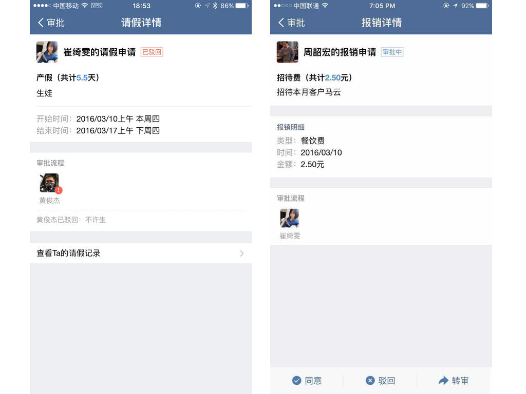 還有符合中國公司的考勤、報銷和打卡功能: