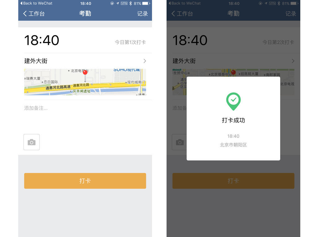 還有一個比較可怕的打卡功能,就是直接抓取員工的地理位置打卡,也可以作為考勤的一部分,員工不能手動調(diào)整距離太遠(yuǎn)的位置來打卡。