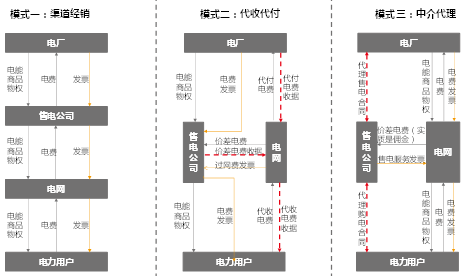 在這種模式下,電能作為商品,其物權從電廠到售電公司再到電網最終到電力用戶(物權流向取決于合同契約,與實際物流方向可以分離,電流方向仍然是電廠到電網再到用戶),售電公司出資向電廠采購電量,再賣給電網,電網最終賣給電力用戶,收取電費。物權流向與資金流方向相對,發票流向與物權流向方向相同,所有應付的服務費、手續費都可以折算在上下游之間的差價里。