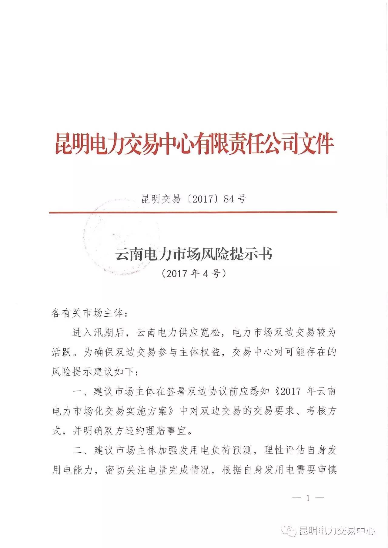 昆明電力交易中心23日發布了關于云南電力市場風險提示書(2017年4號)。進入汛期后,云南電力供應寬松,電力市場交易較為活躍。為確保雙邊交易參與主體權益,交易中心對可能尋在的風險建議市場主體在簽署雙邊協議