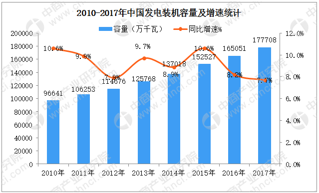 數(shù)據顯示,中國發(fā)電裝機容量不斷提高,并且一直保持快速增長。全國發(fā)電裝機容量從2010年的96641萬千瓦增長至2017年的177708萬千瓦,年均復合增速達9.1%。截止2017年底,全國全口徑發(fā)電裝機容量17.77億千瓦,比上年增長7.7%,增速比上年回落0.5個百分點;風電、太陽能發(fā)電裝機規(guī)模已超國家十三五規(guī)劃目標。