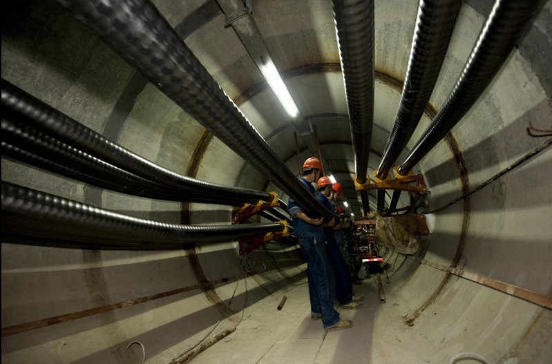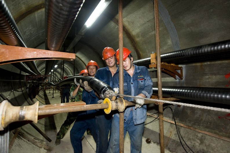 9月12日,電力工人在無錫經貿路15米深的地下電纜隧道中敷設220千伏電纜。近年來,隨著城市進成的加快,無錫新建、改建、擴建的道路越來越多,為適應城市的變化,國網無錫供電公司實施電纜入地工程,將老式柱上