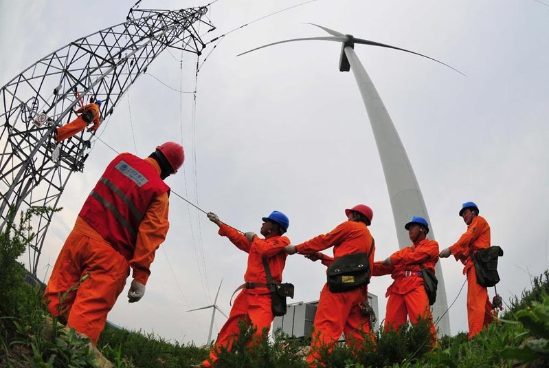 2013年7月8日,安徽省明光市電力工程技術人員在龍源風力發電場為一臺風機更換故障電線。當日,安徽電網風電發電量累計達10 68億千瓦時,風力發電全部優先上網并消納。安徽風電每日發電量達30萬千瓦時,有效緩解
