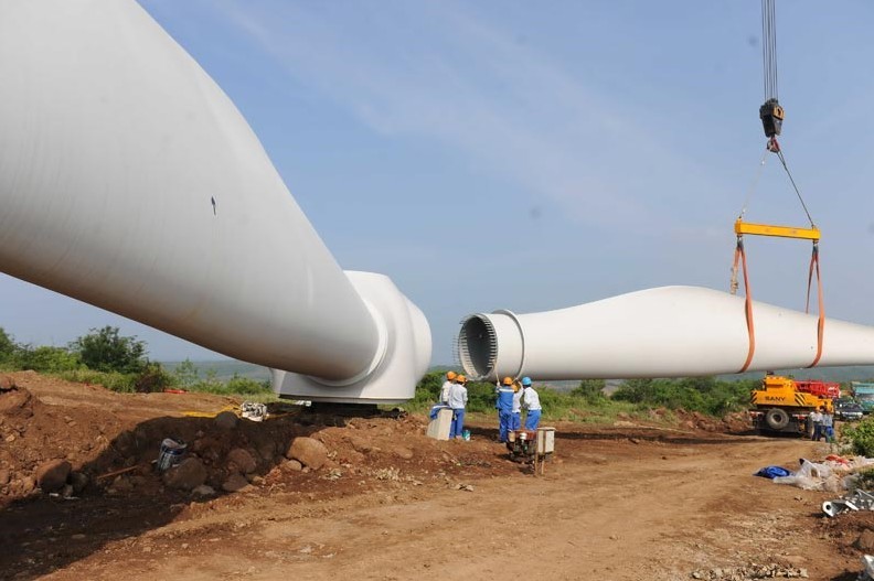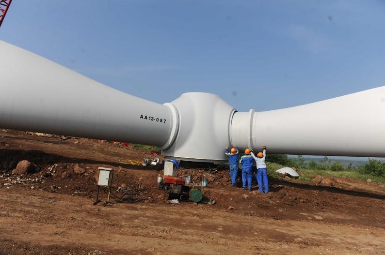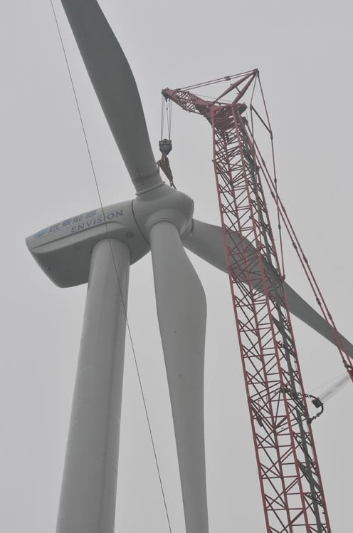 安徽省明光市首座新能源風電場——技術人員正在指揮吊裝魯山風力發電場的最后一臺風機。當日,龍源電力集團股份有限公司安徽省明光市魯山49.5兆瓦風電項目全部建成投產。魯山風電項目位于江淮分水嶺丘陵山區的明光市澗溪鎮,本期工程共安裝33臺單機容量1500千瓦的風電機組,總裝機容量為49.5兆瓦,每年可提供超過1.04億千瓦時的綠色電能投運后,可滿足4萬戶城市居民家庭年用電需求。與同等規模的燃煤電廠相比,每年可以為國家節約標準煤34509噸;減少排放溫室效應氣體99366噸,減少粉塵排放72.5噸,二氧化硫579.噸8,氮氧化物869.6噸,一氧化碳8.1噸。至此,安徽省江淮分水嶺丘陵山區已有楊郢、自來橋、茅山、杏山、大金山、魯山6座風電場。這6座風電場的總裝機容量達到297兆瓦,每年可提供約6.25億千瓦時的綠色電能。