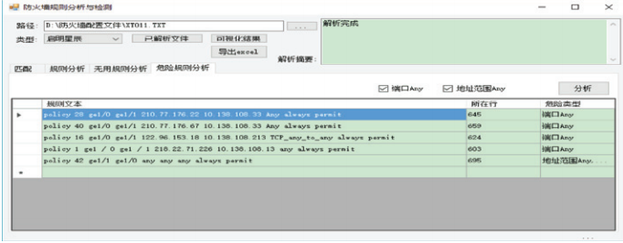 1)危險(xiǎn)策略發(fā)現(xiàn)。工具可以解析出防火墻規(guī)則中設(shè)置范圍過大的規(guī)則,包括端口為ANY、地址范圍沒有限制的策略。危險(xiǎn)規(guī)則分析如