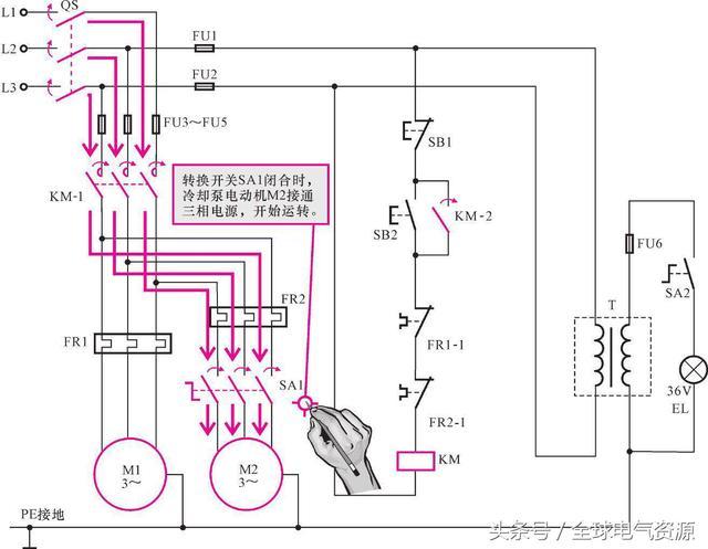 轉(zhuǎn)換開(kāi)關(guān)SA1在閉合狀態(tài)時(shí),冷卻泵電動(dòng)機(jī)M2接通三相電源,開(kāi)始啟動(dòng)運(yùn)轉(zhuǎn)。