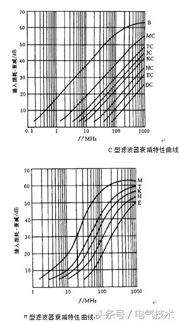 濾波器有高通、低通、帶通、帶阻等幾種,一般來說,EMI濾波連接器大都采用低通濾波器,即允許低于某一額定頻率的信號(hào)通過,對(duì)于高于該額定頻率的信號(hào)則呈現(xiàn)很大的阻抗,這一頻率稱為截止頻率。濾波連接器按濾波形式劃分,主要有C型、π型、及LC型三種電路形式(見圖2),其中C型、π型最為常見。π型濾波性能優(yōu)于C型,它的插入損耗曲線陡度更大,即在給定的頻率和相等的電容下,π型濾波衰減大于C型(見圖3)。